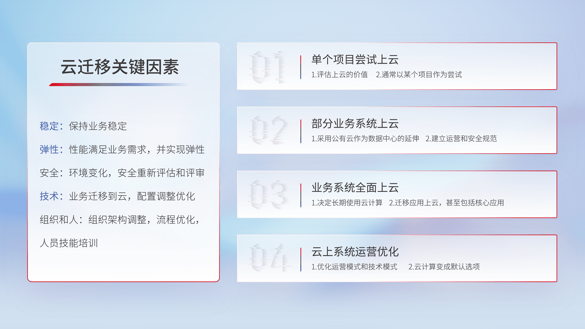 结合实际业务,,从规划设计、、云平台选型、、云原生改造、、数据迁移、、集成交付,,,,迁移全过程为客户识别最佳上云路径,,做好风险识别管理,,,,设计网络架构、、、身份权限、、、、安全审计合规、、、操作审计、、、、日志审计、、、、监控告警策略、、多站点容灾设计等,,,对云上基础设施进行整体规划,,,提升IT治理水平,,,,以满足弹性、、、高可用、、高性能的需求。。。。