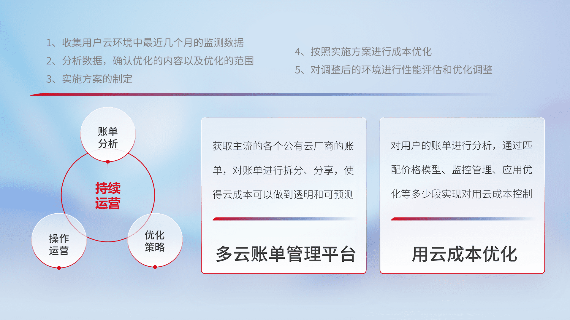 通过多云纳管,,,以统一的资源数据模型把客户的云资源进行抽象和封装,,,进而实现对多云资源的统一操作,,,,保障云资源管理的可靠性、、、、稳定性与可用性。。。量身定制化运维内容,,,,配置、、、开发运维、、、补丁管理、、备份、、、、监控、、、、认证和访问管理、、、、审计和日常巡检等,,保障在用云过程中的可靠度,,,稳定度以及高可用率。。。
