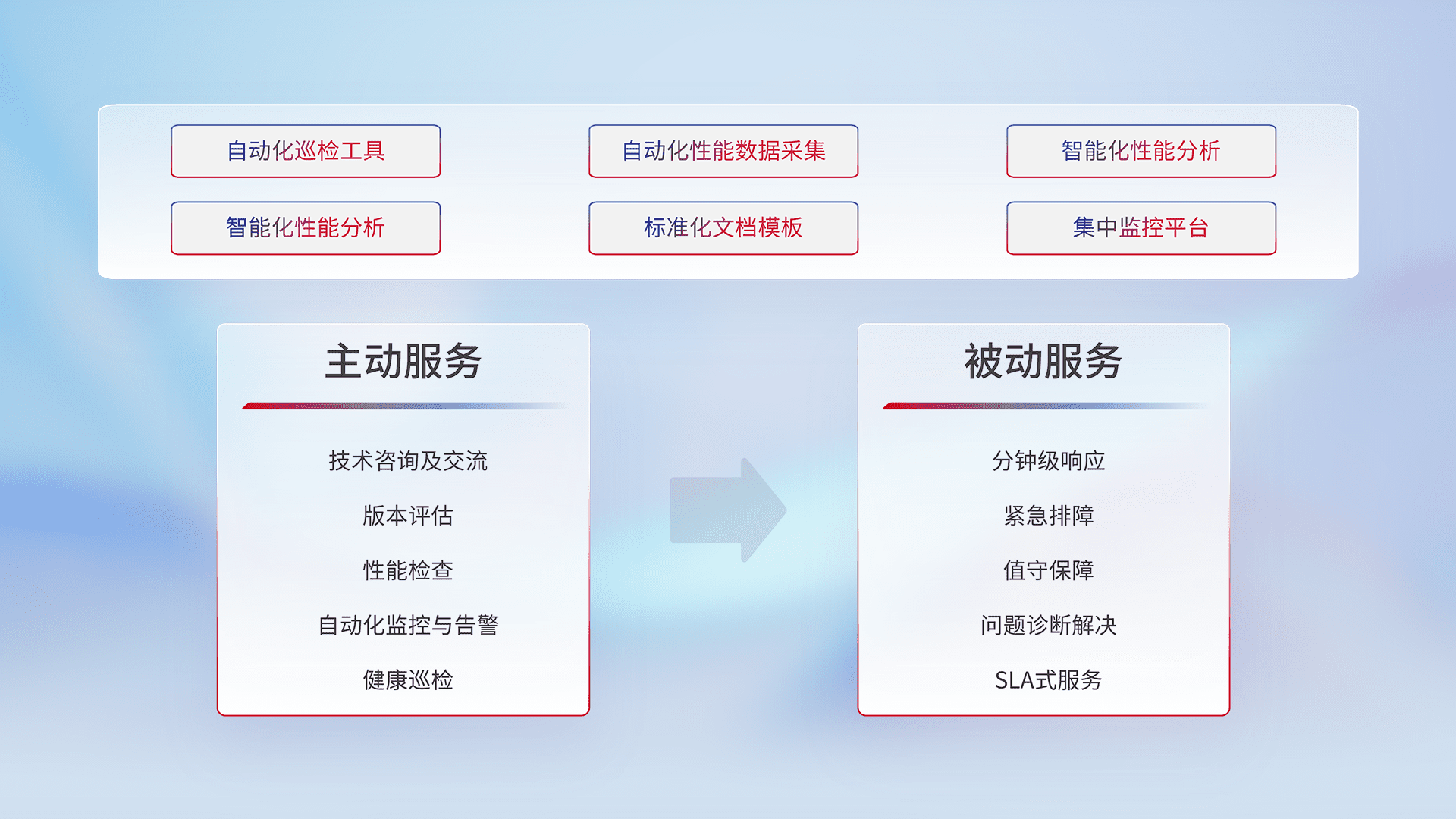 智能化工具和标准化文档,,保障服务质量,,,提供主动服务(包含技术咨询、、、版本评估、、、、性能检查、、自动化监控与告警、、、健康巡检)和被动服务包含(分钟级响应、、、紧急排障、、值守保障、、、问题诊断解决、、、SLA服务)。。。